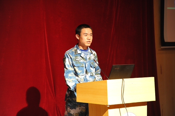 随后,海军预备役下士、公共管理学院马渊同学作了一场题为《携笔从戎,不悔的选择》的报告。他于2009年被选拔进入海军某舰队某大队,在参军的两年时间内,参加多次重大军事演习,服役期间多次随舰队奔赴渤海、黄海、东海、南海、太平洋、印度洋等海域执行训练、巡逻、演习、护航、营救等任务。他说,成为一名军人,是自己从小到大的梦想,两年的军旅生活,磨练了他的意志,锻炼了他的品格,培育了他时刻准备着保卫祖国、为祖国效命的精神。在海军的日子,他时刻以优秀党员为榜样,向他们看齐和学习,加强自己的学习和训练,两次被评为优秀士兵,获营嘉奖一次、团嘉奖一次,记三等功一次,并如愿加入中国共产党。