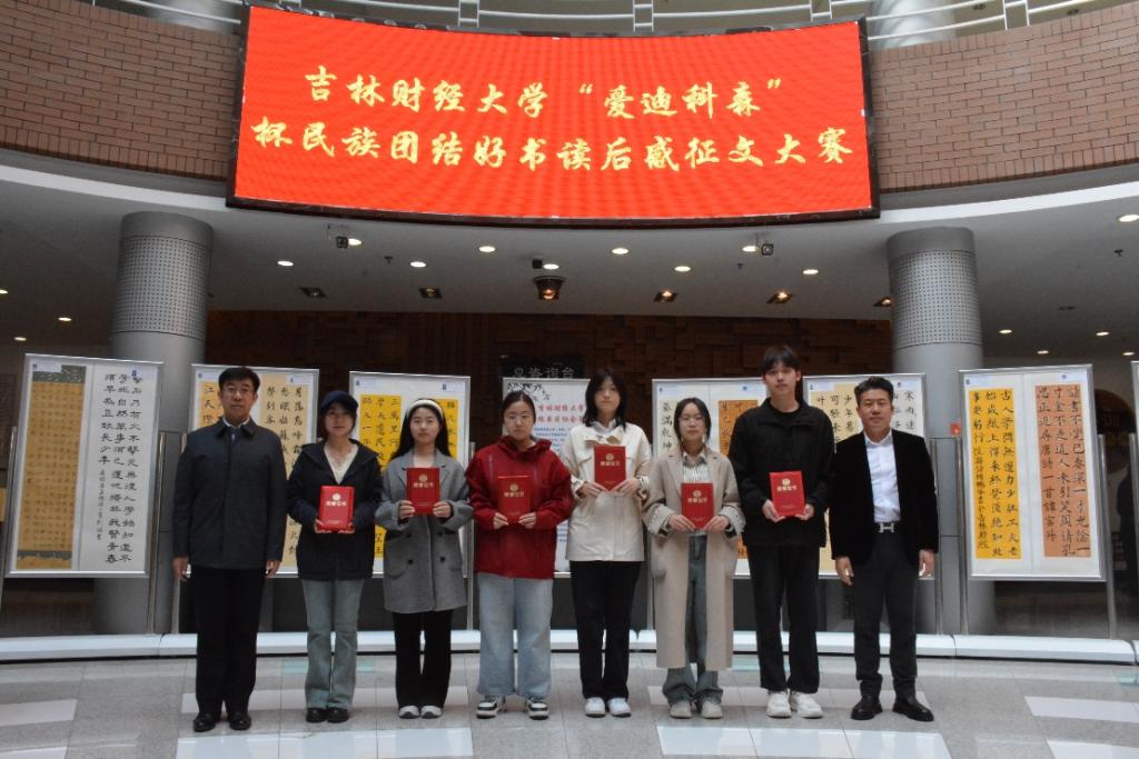 校团委书记孙之光、学工处副处长宋立东为“爱迪科森”杯民族团结好书读后感征文大赛获奖者代表颁奖。