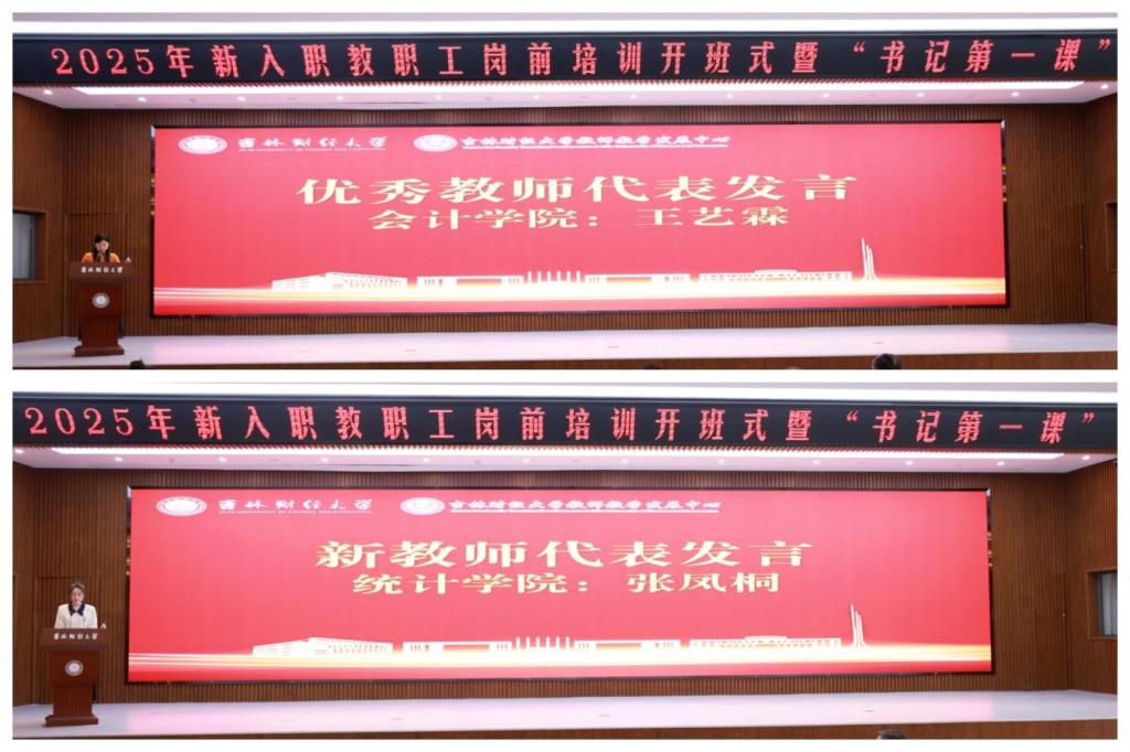 全国高校青年教师教学竞赛三等奖获得者、会计学院教师王艺霖作为优秀教师代表,分享从教心得与育人感悟;统计学院新入职教师张凤桐代表全体人员发言,承诺将以饱满热情投入工作,爱岗爱校,在吉财沃土上书写育人新篇章。