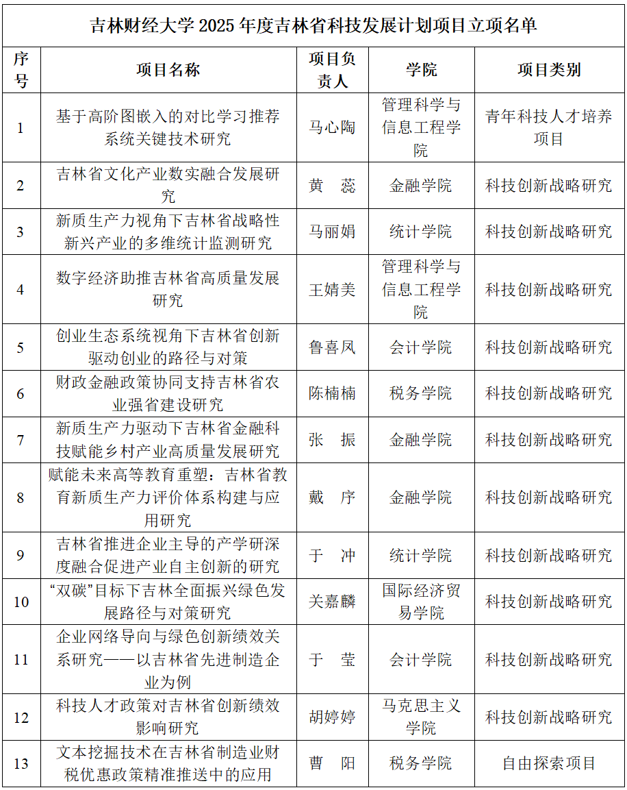 本网讯(科研处 供稿)近日,吉林省科技厅公布了2025年度吉林省科技发展计划项目立项名单,taptap点点共有13个项目获批立项,其中科技创新战略研究类项目11项,自然科学基金(自由探索项目)和青年科技人才培养项目各1项。