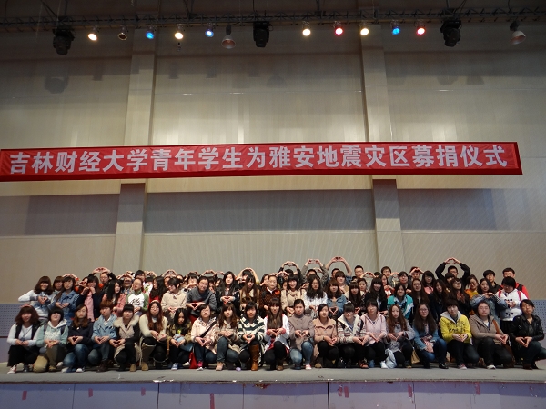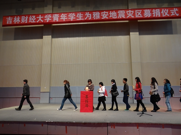 仪式开始时,全体老师同学为灾区罹难同胞默哀一分钟,以寄托哀思。校学生会主席王林贺同学代表全校学生做了题为《支持雅安,寻找每一个生命奇迹》的发言,对地震灾情进行了介绍,他号召全校广大同学立即行动起来,弘扬我们民族的伟大精神,积极为灾区人民捐款,献出我们的点滴之爱,尽自己的绵薄之力帮助灾区人民尽早摆脱困境。新青年志愿者联合会主席汪璨同学宣读了《倡议书》。伴随着《爱的奉献》的歌声,300多名青年学生代表依次上台,把装满本班学生爱心善款的信封投进了募捐箱。不到半个小时,全校同学共为灾区捐款12万余元。
