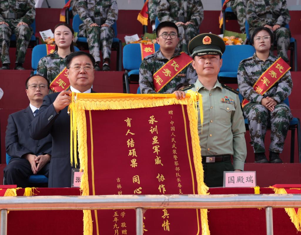 张炳辉代表学校党委向承训部队赠送锦旗。
