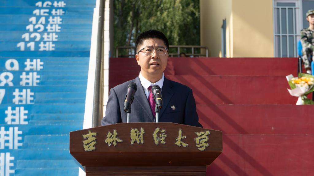 语言文化学院学生周广权代表2025级学生发言。他表示,军训历程中,同学们挥洒汗水、淬炼意志、收获成长。未来,全体同学必将传承集体主义与爱国主义精神,勇于攻坚克难、直面挑战,以军训中点燃的奋斗之火照亮前行之路,努力成长为有理想、有担当的吉财人,成为有作为、有梦想的新时代青年。