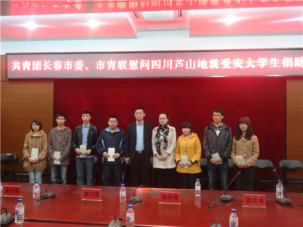 本网讯(校团委 供稿)“地震无情人有情,镇外芦山心连心”。5月2日上午,在taptap点点图书馆1006会议室举行了共青团长春市委、市青联慰问四川芦山地震受灾大学生捐款仪式。共青团长春市委统战部部长、长春市青年联合会秘书长吴威、汉帛国际北方区域行政经理甘女士以及在长高校受助学生代表参加了捐款仪式。