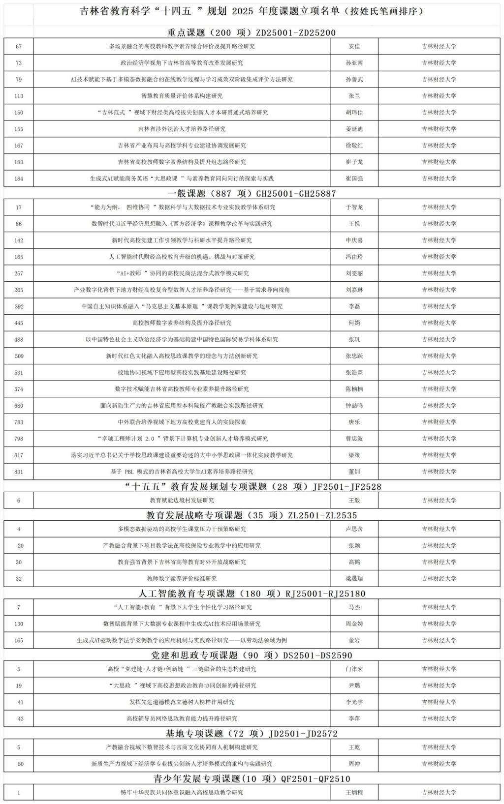 本年度获批课题呈现出覆盖广、质量高、聚焦准的特点,其中,多项围绕人工智能与财经教育深度融合、数智化人才培养模式创新、“大思政课”建设路径优化等前沿议题展开,精准对接了吉林省教育强省建设的现实需求。