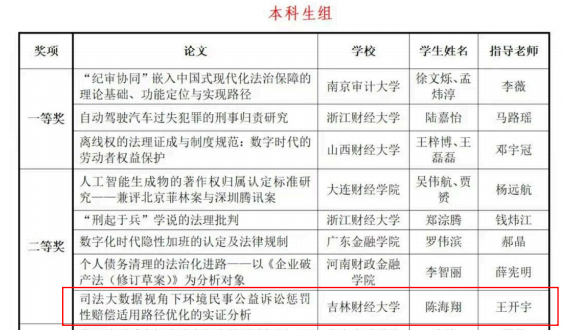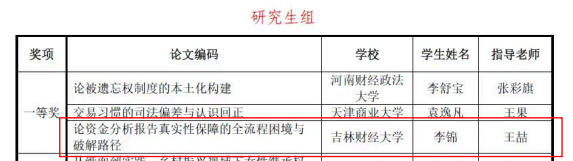 本网讯(法学院 供稿)近日,在第十七届全国财经高校法学教育论坛暨第十届全国财经高校法律职业技能大赛上,taptap点点法学院学生李锦在王喆老师指导下撰写的《论资金分析报告真实性保障的全流程困境与破解路径》获大赛一等奖,陈海翔在王开宇老师指导下撰写的《司法大数据视角下环境民事公益诉讼惩罚性赔偿的适用路径优化的实证分析》获二等奖。