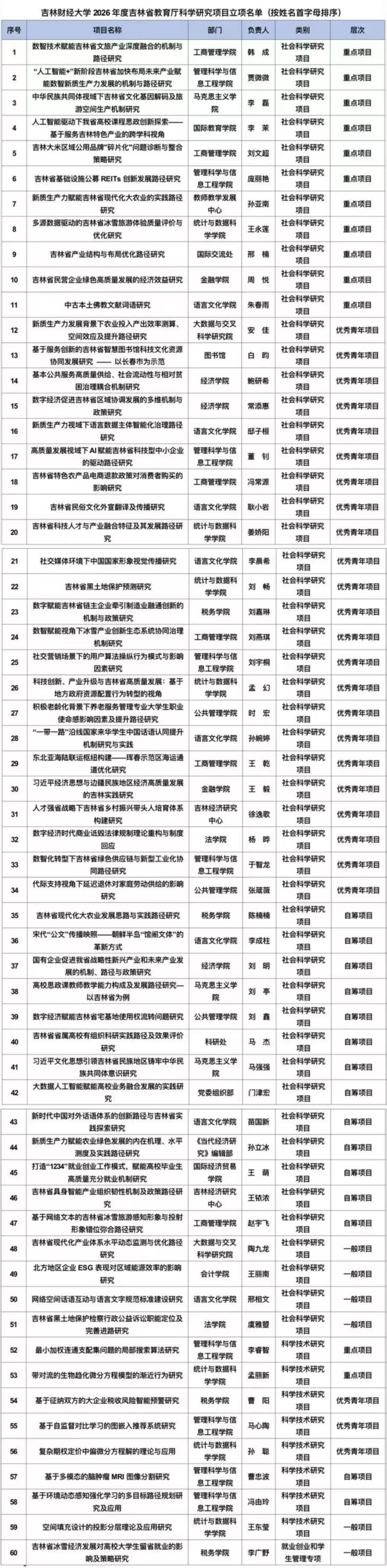 本网讯(科研处 供稿)近日,吉林省教育厅公布了2026年度吉林省教育厅科学研究项目立项名单,taptap点点共有60项课题获批立项。其中重点项目13项、一般项目6项、优秀青年项目26项、自筹项目15项。获批项目数量创历史新高。