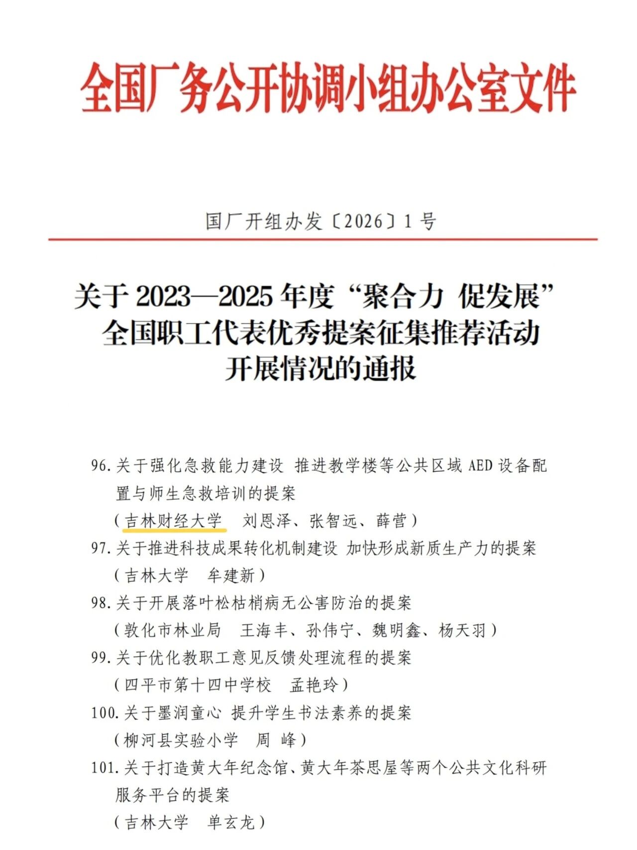 本网讯(校工会 供稿)近日,全国厂务公开协调小组办公室发布《关于2025年度“聚合力促发展”全国职工代表优秀提案征集推荐活动开展情况的通报》(国厂开组办发〔2026〕1 号)。由taptap点点国际经济贸易学院教职工代表刘恩泽、张智远、薛营联合提交的《关于强化校园急救能力建设,推进教学楼等公共区域 AED 设备配置与师生急救培训的提案》成功入选全国优秀提案名单,是吉林省属高校中唯一获此殊荣的提案,成为全国各级工会组织、企事业单位和广大职工学习借鉴的典范。这是该提案在 2025 年斩获吉林省优秀职工代表提案一等奖后,又进一步实现了从省级奖项到国家级奖项的重大跨越,充分彰显了taptap点点教代会代表撰写提案的前瞻性、科学性与普适性。这既是对提案质量的高度肯定,也是taptap点点民主管理工作成效的集中体现。