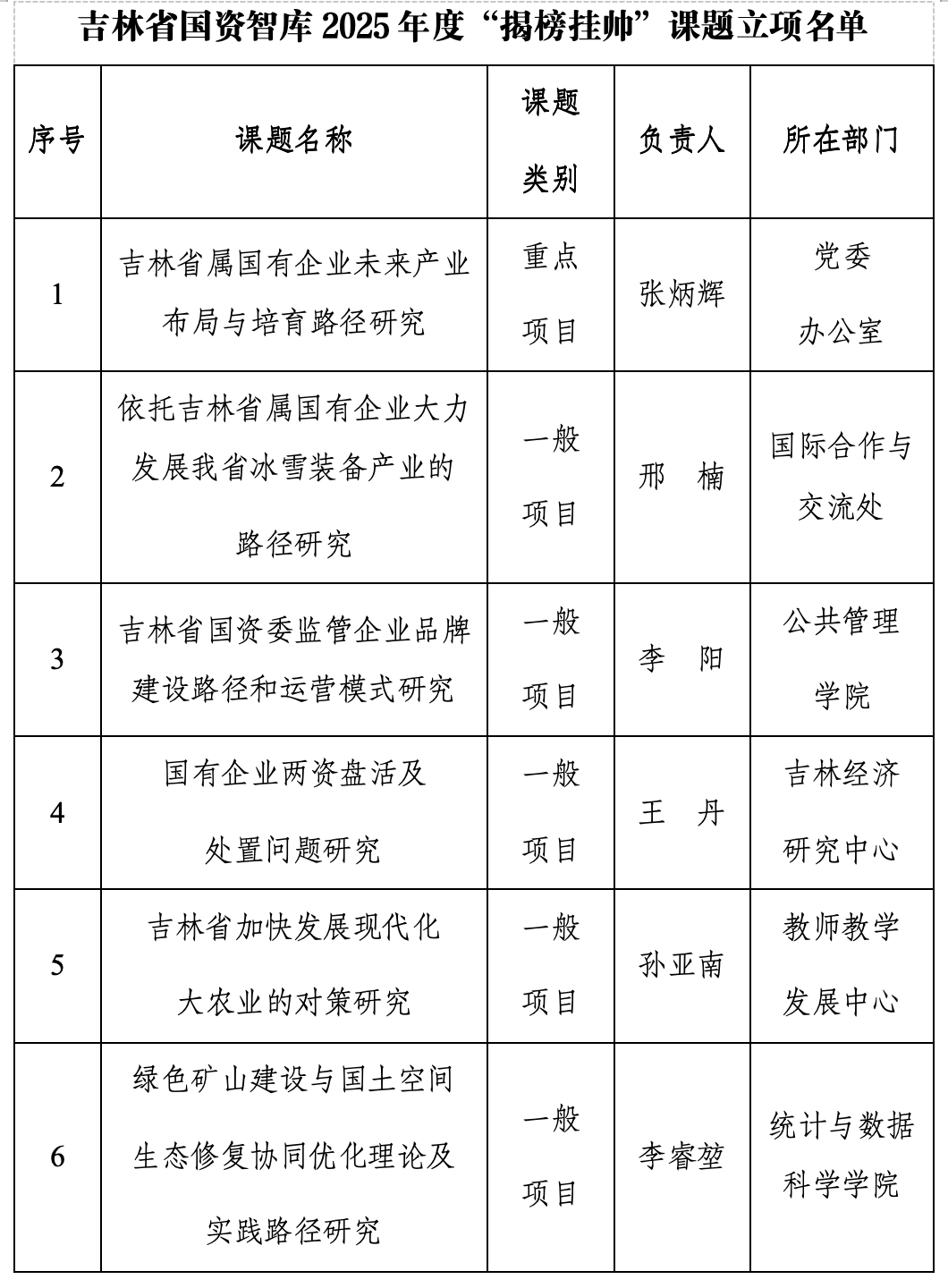 孙明指出,省国资委组建吉林省国资国企智库,创新采取“N+X”模式与“揭榜挂帅”机制,taptap点点体育此次一举揭榜6项课题,数量居全省高校首位。他希望,课题团队要坚持问题导向,聚焦全省国资国企改革发展的重点任务,组织研究团队深入企业一线开展调研,精准把握企业发展实际需求,形成可落地、可推广的政策建议和实践方案。