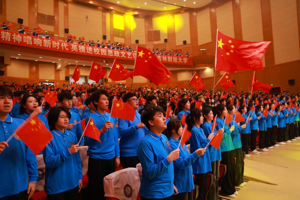 活动尾声,王明明教授引领全场齐唱《跟党走》,学生伴舞让红色旋律更具感染力;全体人员共同高唱《没有共产党就没有新中国》,礼堂内两侧通道、一楼、二楼观众挥舞国旗,歌声嘹亮,成为现场最动人的红色风景,凝聚起全体师生跟党走、勇奋进的坚定信仰。