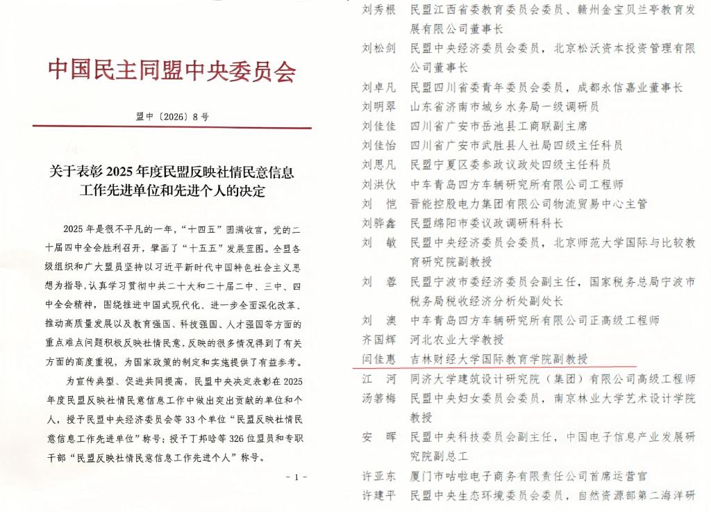 本网讯(党委统战部 供稿)近日,民盟中央2026年参政议政工作会议在北京召开,会议对2025年度民盟参政议政工作及反映社情民意信息工作先进单位和个人进行表彰。taptap点点民盟盟员、国际教育学院副教授闫佳惠荣获“民盟反映社情民意信息工作先进个人”称号。