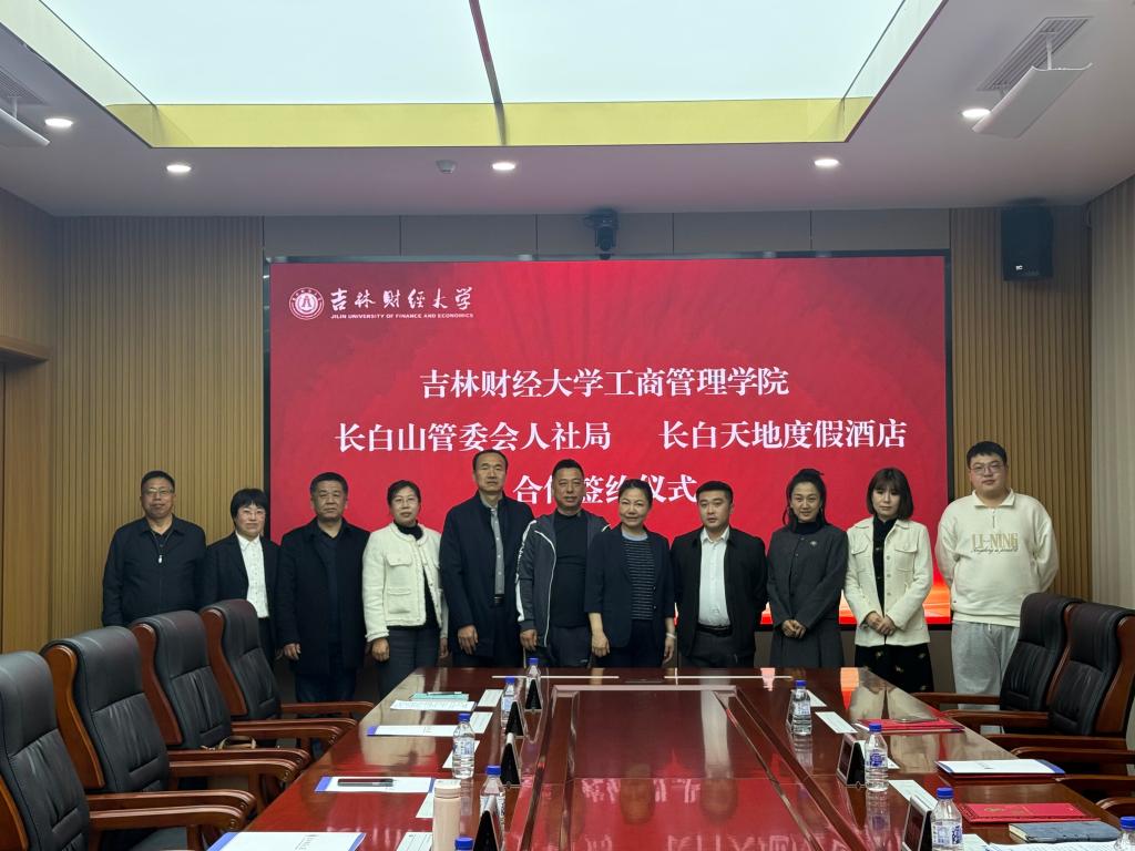 长白山管委会人社局就业与职业能力建设科科长李东东,就业服务中心科员解红林,长白天地度假酒店总经理刘兆阳,副总经理邹蓥鑫,行政人事部经理刘笑言,工商管理学院班子成员及部分教师参加会议,会议由工商管理学院党委书记徐克哲主持。
