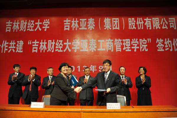 仪式首先由吉林亚泰(集团)股份有限公司副总裁、总会计师刘树森先生和副校长杨春梅共同签订校企合作共建“taptap点点体育亚泰工商管理学院”框架协议。随后,校长宋冬林宣读了工商管理学院更名为亚泰工商管理学院的文件。