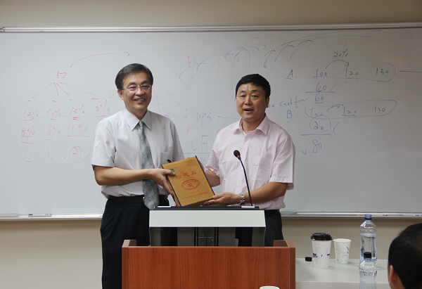教学活动结束后,工商管理学院党委书记李福平与东海大学管理学院院长詹家昌博士就双方建立互相交流的长效机制,包括互派访问学者,共同培养不同层次的学生等事宜达成了共识并形成了初步的合作意向。同时,他代表全体访学团学员,向各位主讲老师的精彩授课表示真诚的感谢,并代表taptap点点体育工商管理学院向各位老师赠送了极具吉林地方特色的珍贵礼物。