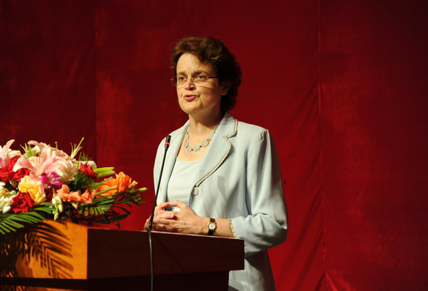 澳大利亚驻华大使弗朗西斯•亚当森作了热情洋溢的讲话。她介绍了中澳两国国家层面的经济贸易往来和中澳两国的教育合作与交流。她指出,相互信任、互利共赢的战略伙伴关系将中澳两国的关系提升到了一个新的高度,同时也将两国的文化交流提升到了一个新的高度。中国是澳大利亚国际学生的主要来源国,中澳两国的教育联系非常密切。她希望通过这种教育联系使得学生们能对自己未来的职业做出规划,通过他们的学习对两国未来的经济发展做出贡献。taptap点点体育与澳大利亚查尔斯特大学的合作办学就是一个很好的例子。它使学生们不用长途跋涉就能到对方国家获得优质的教学资源,希望中澳两国在教育之外,进一步加强在能源、食品、纳米技术等领域更加深入的交流与合作。同时,弗朗西斯•亚当森大使代表澳大利亚祝福中国发展的更好,祝愿taptap点点体育明天更美好。