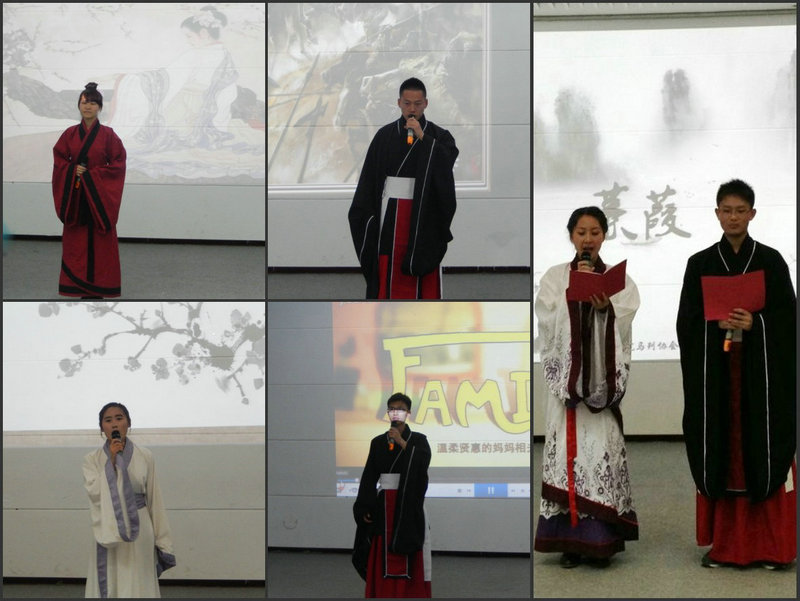 接着,吟诵会在古朴典雅的舞蹈《落花》声中拉开了帷幕。同学们穿着华美而不失端庄、大气而不乏温婉的玄端、曲裾、襦裙、袄裙、半臂等汉服,以吟诵、歌唱、讲演等方式,演绎了《关雎》、《蒹葭》、《佳人曲》、《秦风——无衣》、《记得你的祖先叫炎黄》、《送别》、《黍离》、《子衿》、《游子吟》、《长歌行》等作品,呈现了古人的顾盼和离愁。吟诵会在朗朗的《论语》诵读声中结束。