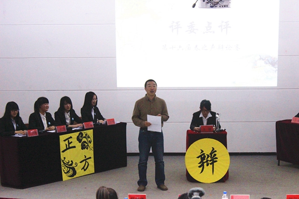 比赛结果公布前,评委郭伊楠老师对本场比赛进行了精彩的点评,他表示,今年正值纪念抗日战争胜利70周年,本场比赛的辩题与时事联系紧密,选手们也准备了丰富的历史时政资料。在充分肯定选手们的表现同时,郭老师也针对选手的不足之处给予指导,还向大家分享了自己对辩题的理解和辩论技巧,令场上选手和在座同学受益匪浅。