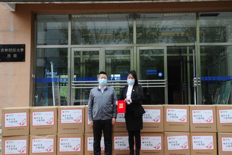 捐赠仪式在校医院举行,副校长、校疫情防控工作领导小组常务副组长于金欢代表学校向吉林银行净月潭支行行长姜翰颁发了捐赠证书。