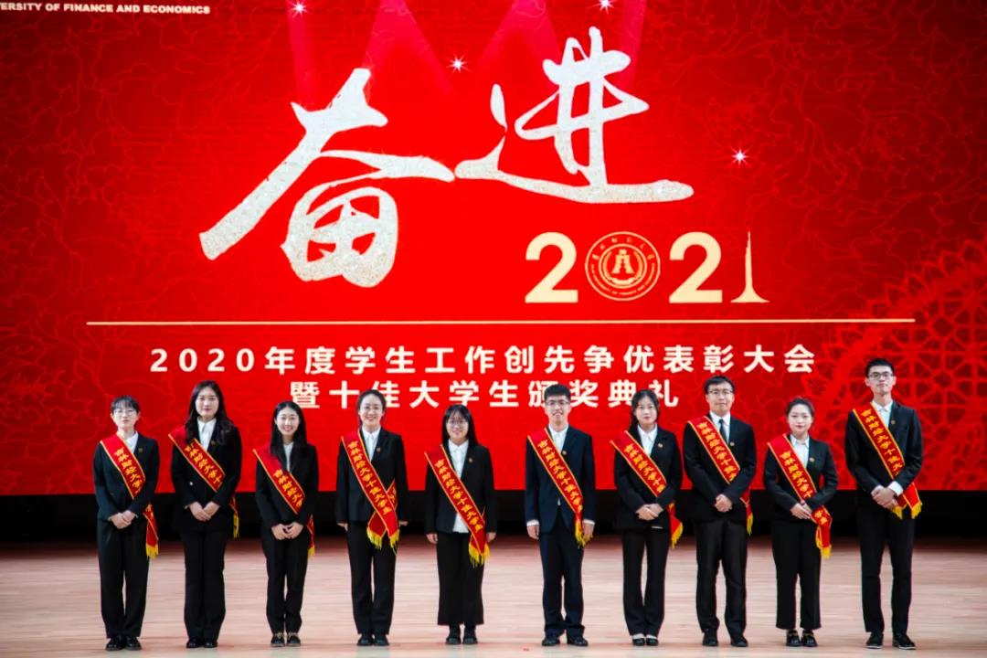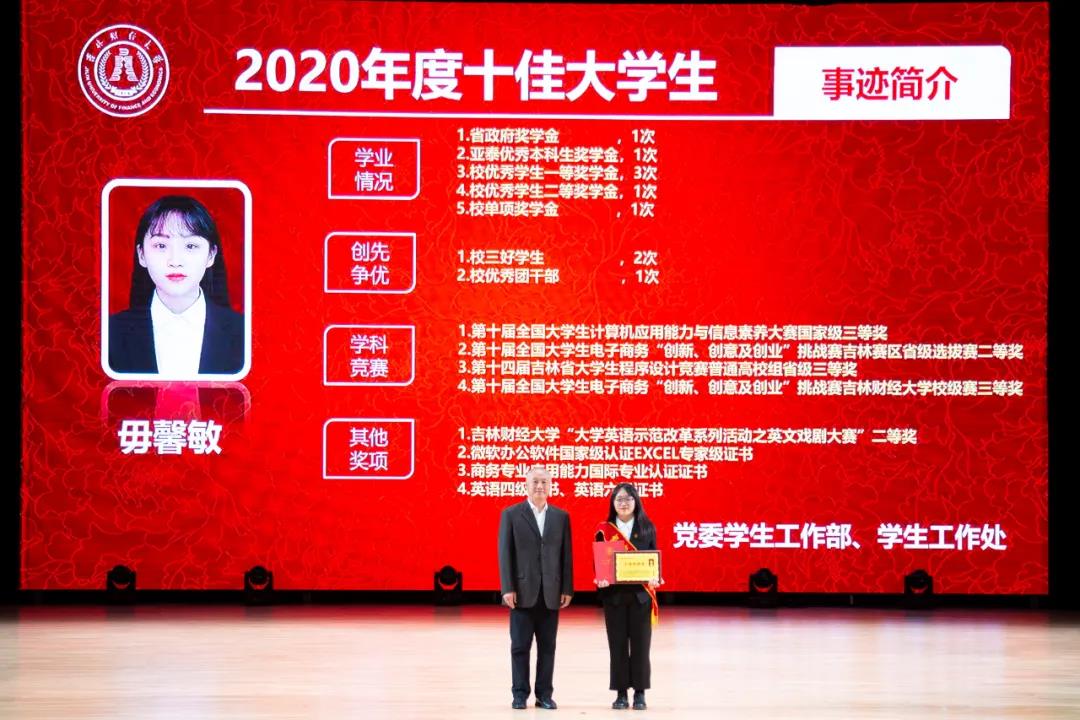 在随后进行的“十佳大学生”颁奖典礼仪式上,统计学院胡悦欣、国际交流学院于明禾、会计学院齐雨竹、应用数学学院牟洋琳、管理科学与信息工程学院毋馨敏、九台农商银行金融学院娄云深、税务学院马荣雪、亚泰工商管理学院王汛、公共管理学院于靖一、亚泰工商管理学院楼大成十名荣获2020年度“十佳大学生”荣誉称号的同学受到了表彰。“十佳大学生”辅导员为他们宣读了颁奖词,各学院党委、党总支书记为本学院“十佳大学生”颁发了奖牌和荣誉证书,获奖学生发表了感言,表达了自己获得这一殊荣的欣喜和对学校培养的感激之情。