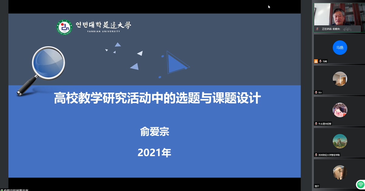 本网讯(管信学院 供稿)11月3日,应管信学院邀请,延边大学师范学院院长俞爱宗教授通过腾讯会议作了题为“高校教研活动中的选题与课题设计”的学术报告。报告会由管理科学与信息工程学院副院长姜建华主持,学院教师通过线上、线下两种方式参加了本次报告会。
