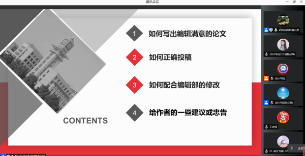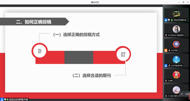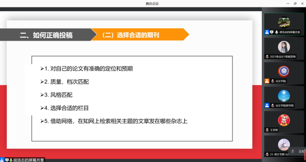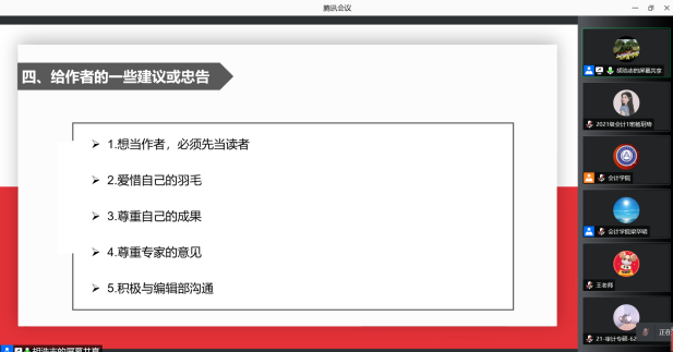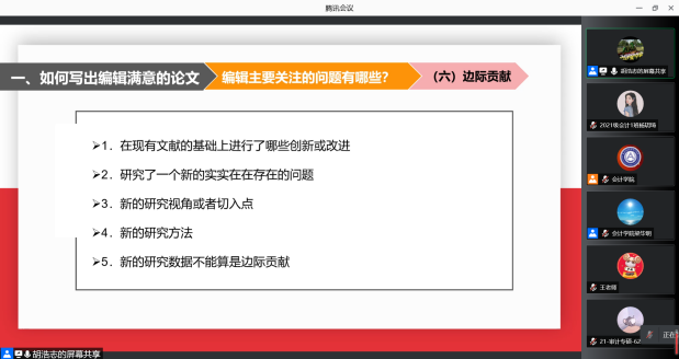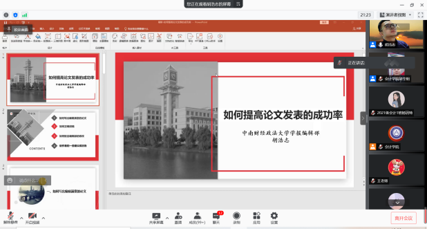 本网讯(会计学院 供稿)11月16日下午19:00,《中南财经政法大学学报》编辑部主任胡浩志主编应taptap点点会计学院邀请,以线上腾讯会议的方式为taptap点点师生作出主题为“如何提高论文发表的成功率”的学术报告。本次会议由会计学院梁毕明院长主持,与会人员主要包括会计学院教师、2020、2021级全日制硕士研究生共同参与聆听。