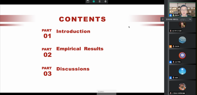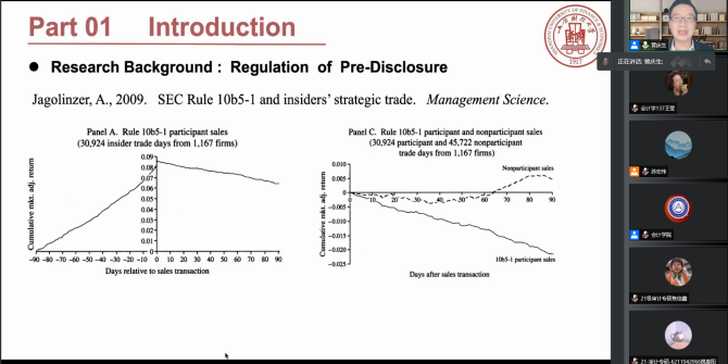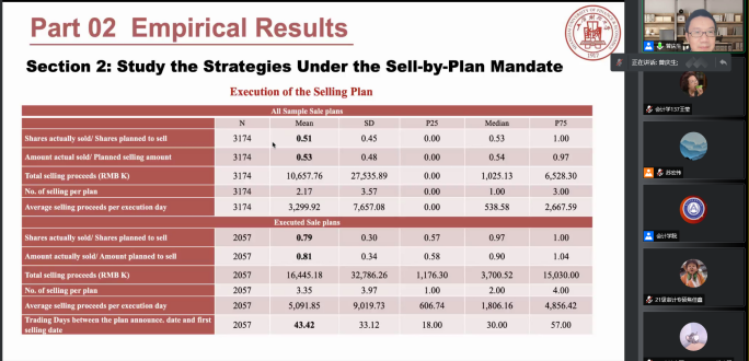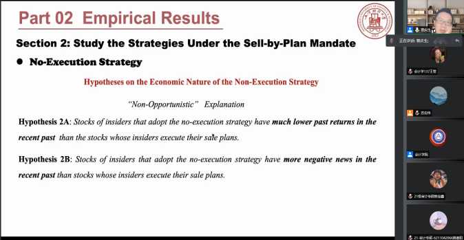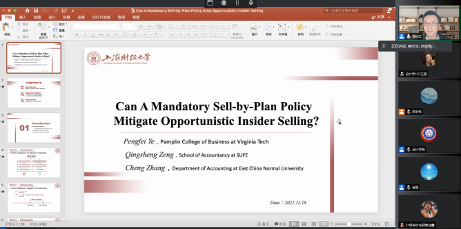 本网讯(会计学院 供稿)11月18日下午19:00,上海财经大学会计学院教授、博士生导师、副院长曾庆生教授应taptap点点会计学院邀请,以线上腾讯会议的方式为我院师生作出主题为“Can A Mandatory Sell-by- Plan Policy Mitigate Opportunistic Insider Selling”的学术报告。本次会议由会计学院专硕教育中心主任苏宏伟老师主持,参会人员主要包括会计学院教师、2020、2021级全日制研究生共同参与聆听。