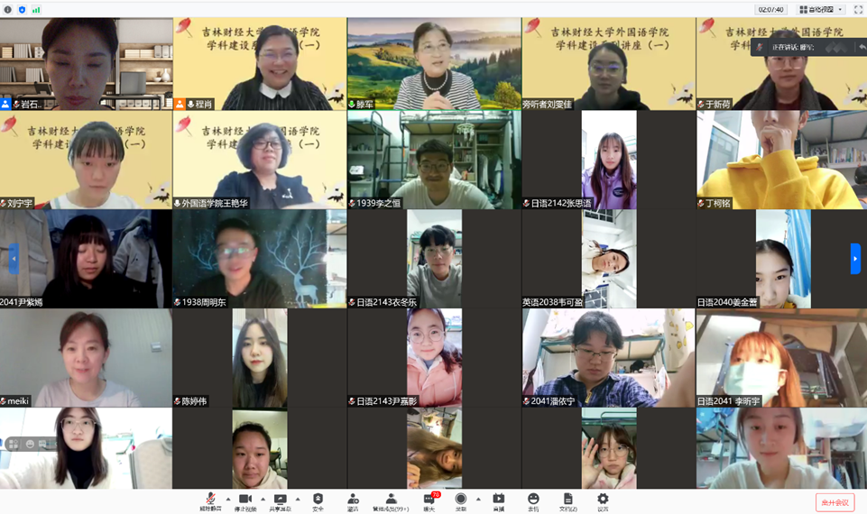 首讲由外语学院院长王艳华教授致辞并总结,日语系主任丁文博主持互动环节,日语专业21级研究生全体在线辅助工作。讲座内容精彩,受到校内外众多老师和同学们的共同关注,讲座期间的在线听讲人数一直呈现高上线率和持续在线的高保持率。
