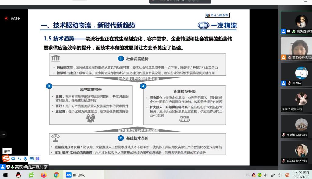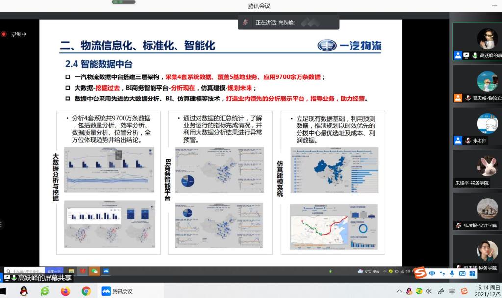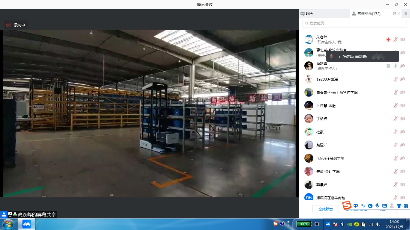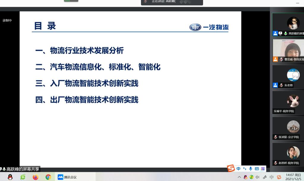 本网讯(物流产业经济与智能物流实验室)12月5日下午,物流产业经济与智能物流实验室以线上腾讯会议的方式举办了“物流+”大讲堂第二讲暨高跃峰学术报告会。高跃峰工程师作了题为“物流企业数智化升级经验分享”的专题报告。物流产业经济与智能物流实验室、亚泰工商管理学院、管理科学与信息工程学院、统计学院、会计学院、金融学院、税务学院、国际经济贸易学院、法学院等172名师生参加了报告会。报告会由物流产业经济与智能物流实验室主任曹忠威主持。