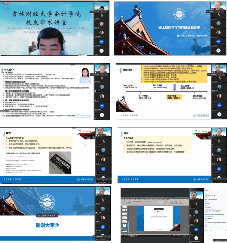 本网讯(会计学院 供稿)在学校党委坚强领导下,为切实加强疫情期间会计学子思想引领和教育教学, 全面做好疫情防控工作,会计学院以校友资源为依托,进一步凝聚校友力量,组织举办“党旗领航共抗疫,守护校园创平安系列活动——校友有约”活动。活动邀请到各界校友为同学们分享责任担当、爱心奉献、求职心得、工作感悟等问题。通过活动帮助同学们调整心态、提高认识,积极防护,以积极心态投入到各项学习、生活中去。3月16日下午18:00,taptap点点体育2021届会计专业硕士研究生毕业生,现就读于哈尔滨工程大学经济管理学院管理科学与工程专业博士徐梦师姐应taptap点点会计学院邀请,以线上腾讯会议的方式为会计学院学生作题为“硕士期间学习与科研经验分享”的学术交流会。本次会议由会计学院专硕教育中心主任苏宏伟老师主持,与会人员主要包括会计学院2020、2021级全日制研究生近300位同学参与聆听。
