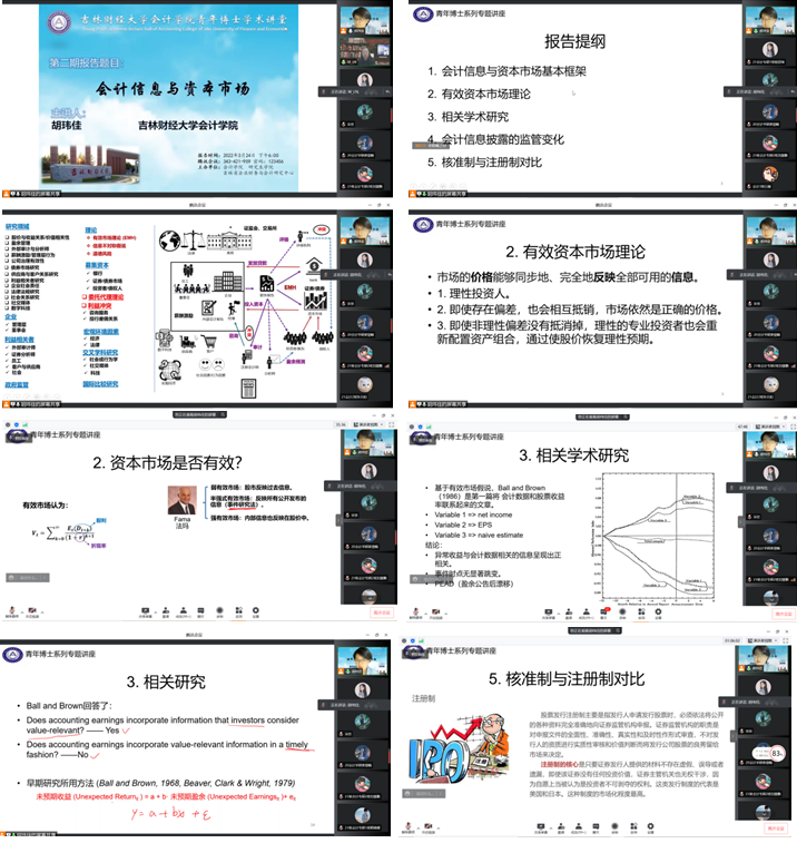 本网讯(会计学院 供稿)疫情特殊时期,为丰富和充实研究生业余活动和提升科研水平,taptap点点体育会计学院举行青年博士系列专题讲座,3月24日下午18:00,由taptap点点体育会计学院国际会计系胡玮佳老师以线上腾讯会议的方式为我院学生作主题为“会计信息与资本市场”的学术报告。该次会议由taptap点点体育会计学院副院长王丽南老师主持,会计学院2020、2021级全日制研究生以及部分本科生总计三百余人共同参与聆听。