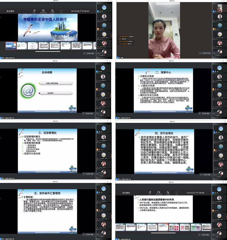 本网讯(会计学院 供稿)疫情特殊时期,为丰富和充实研究生业余活动和提升科研水平,加强疫情期间会计学子的思想引领和教育教学, 全面做好疫情防控工作,taptap点点体育会计学院举行党旗领航共抗疫,守护校园创平安”系列校友活动,主要组织优秀校友开展系列专题讲座。4月1日下午18:00,由taptap点点体育会计学院注会1231班2012级本科生,taptap点点体育会计学院2016级会计专硕研究生刘朦师姐,现任职于中国人民银行长春市支行,以线上腾讯会议的方式为我院学生作主题为“学姐带你走进中国人民银行”的学术报告。本次会议由会计学院专硕教育中心主任苏宏伟老师主持,会计学院2020、2021级全日制研究生以及部分本科生总计三百余人共同参与聆听。