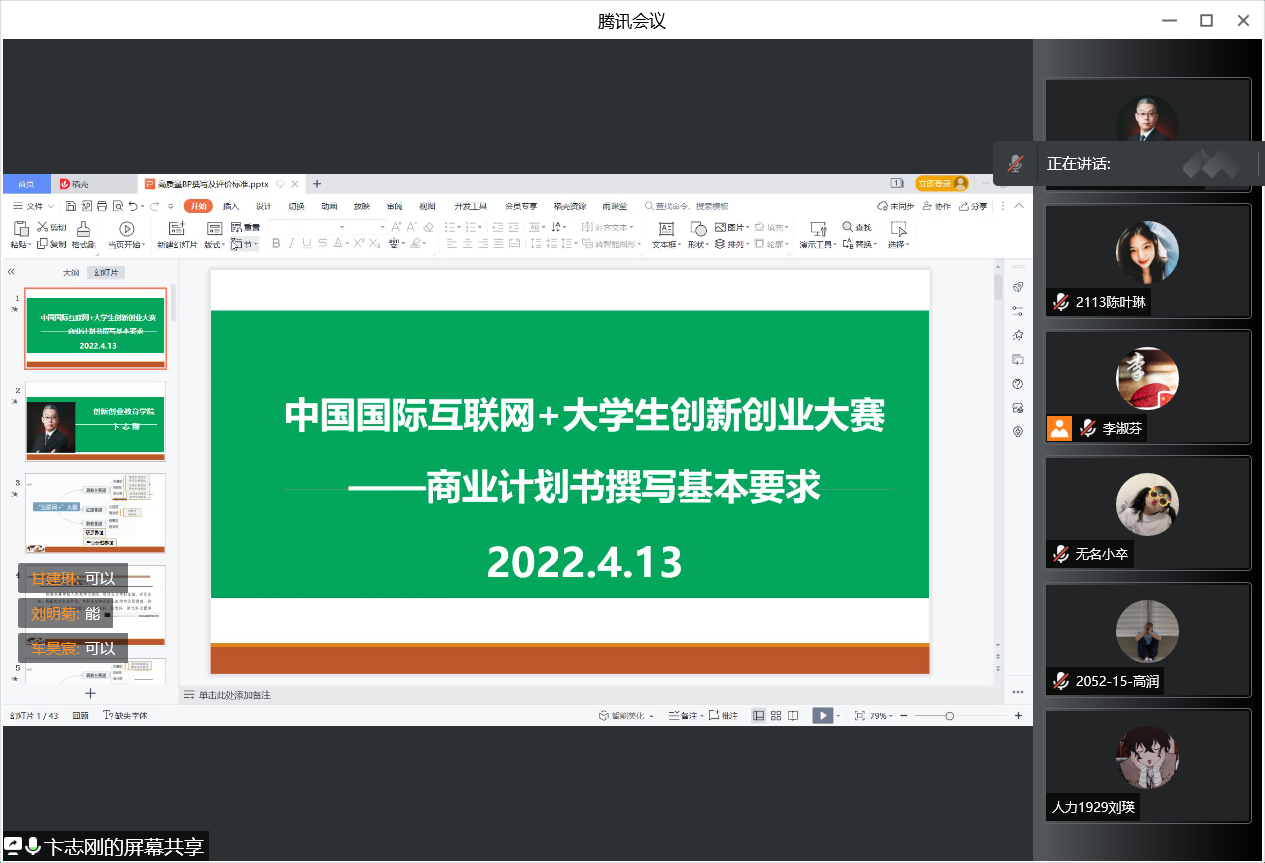 在往期报告中,卞院长带领同学们认识“创新创业类”竞赛,深入了解中国国际“互联网+”大学生创新创业大赛,帮助同学们精准定位,做出合理的赛道选择。本次报告2个小时,共有240余人在线收听。报告中,卞院长首先对往期的内容进行了补充说明。随后,卞院长对创业计划书撰写的相关信息、创业计划书撰写的十大法则、演讲ppt的制作和路演等方面进行讲解。其中,卞院长着重介绍了创业计划书的核心内容,包括封面的设计、执行摘要的内容和写作要求、对企业的介绍、行业与市场可行性分、产品服务可行性分析、营销计划、管理团队和组织结构、运行计划、财务计划、风险应对措施、附件和备查资料等。最后,卞院长与在线同学积极互动,解决同学们提出的问题,整个培训氛围良好。