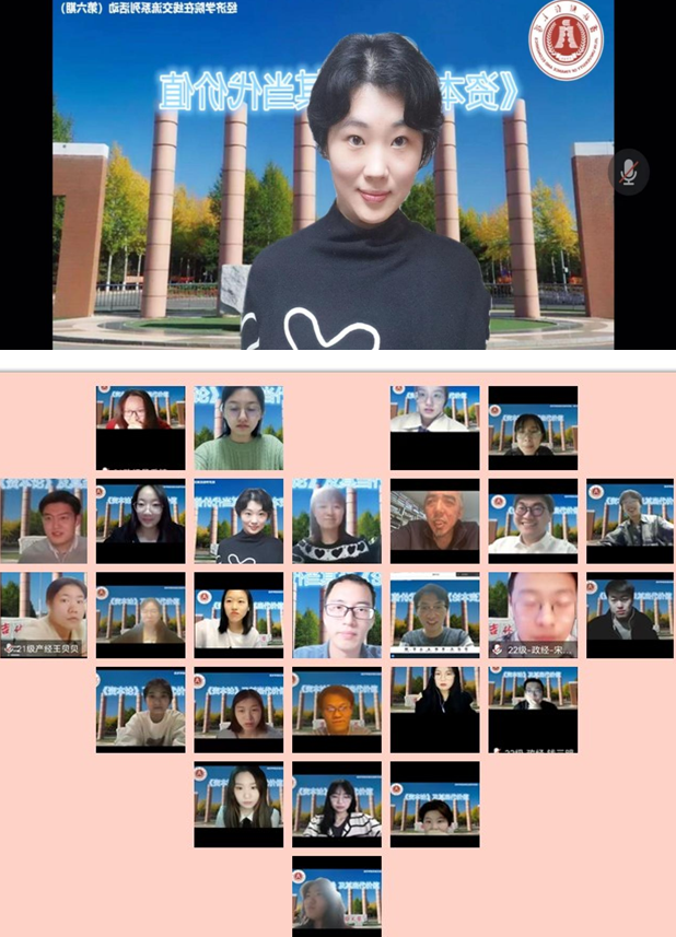 本网讯(经济学院 供稿)在疫情防控的特殊时期,为切实关注学生的身心健康与学习生活,4月20日,经济学院通过腾讯会议举行了“抗疫你我 课堂内外”在线教学系列交流活动第六期。青年教师张巩为学院师生作了题为“《资本论》及其当代价值”的学术报告。经济学院张洪梅院长、王洋副院长、部分教师代表、全体研究生及2022级研究生新生参加了报告会。报告会由经济学院2021级研究生班长葛润润主持。