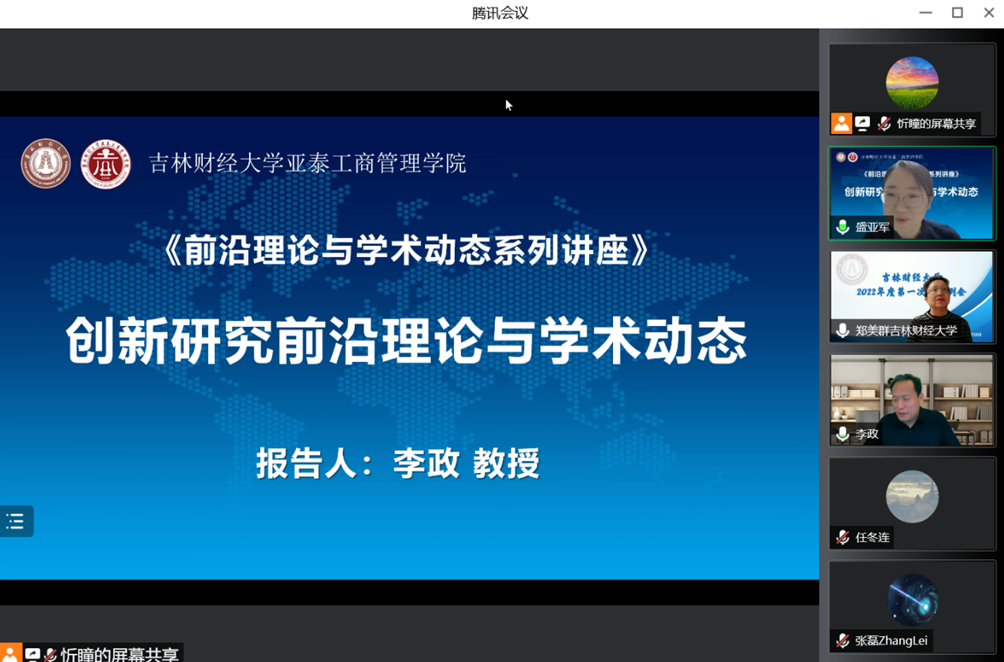 本网讯(亚泰工商管理学院 供稿)近日,由亚泰工商管理学院主办,科研处、吉林省服务业研究基地、吉林省企业管理创新研究中心、创新创业研究中心联合承办的题为《创新研究前沿理论与学术动态》的学术报告在腾讯会议线上举行。此次报告由吉林大学“匡亚明学者”领军教授李政教授主讲,亚泰工商管理学院科研副院长盛亚军主持,学院全体教师及其他校内外教师参加了会议。