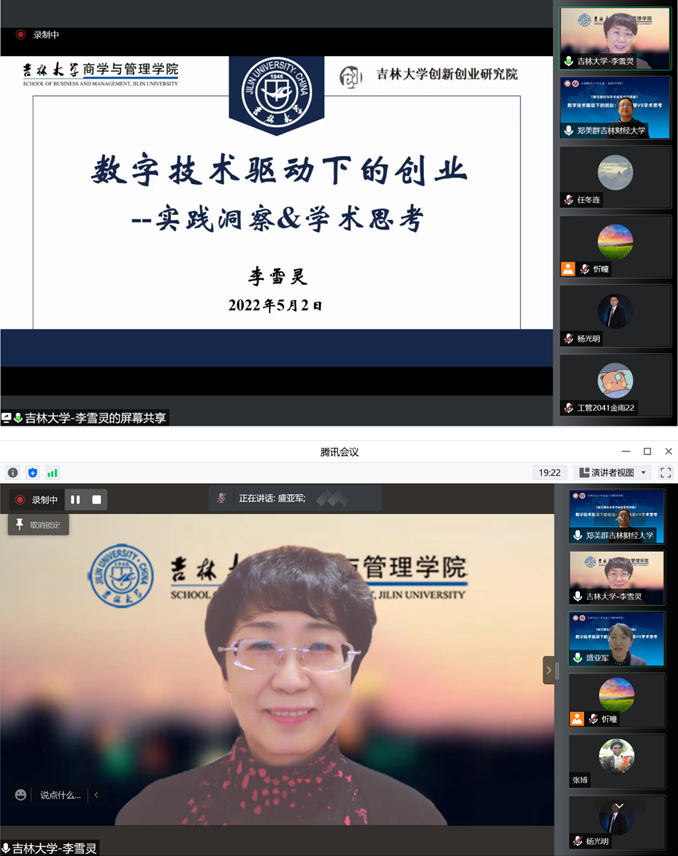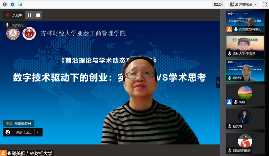 本网讯(亚泰工商管理学院 供稿)近日,由亚泰工商管理学院主办,科研处、吉林省服务业研究基地、吉林省企业管理创新研究中心、创新创业研究中心联合承办的题为《数字技术驱动下的创业:实践观察VS学术思考》的学术报告在腾讯会议线上举行。此次报告由吉林大学商学与管理学院副院长李雪灵教授主讲,亚泰工商管理学院科研副院长盛亚军主持,学院全体教师及其他校内外教师参加了会议。