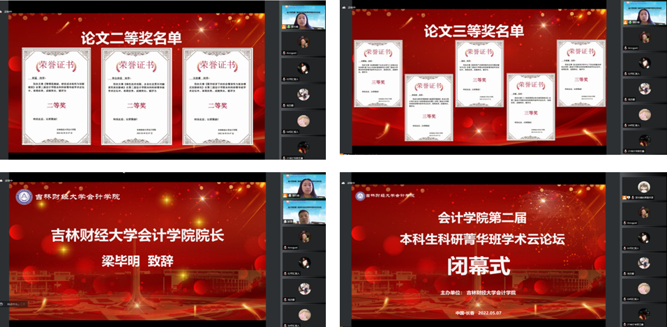 科研菁华班学术云论坛闭幕式由会计学院梁毕明院长致辞,梁院长对本次本科菁华班科研学术论坛做出贡献的学校领导、评委老师、指导教师、投稿学生以及幕后工作者表示感谢,对我院师生在论文撰写过程中的成长进步倍感高兴,并为学术论坛的成功举办表示祝贺,本次学术讨论激发了疫情期间全院师生科研探索的热情,为会计学院打造出了学术交流的氛围。