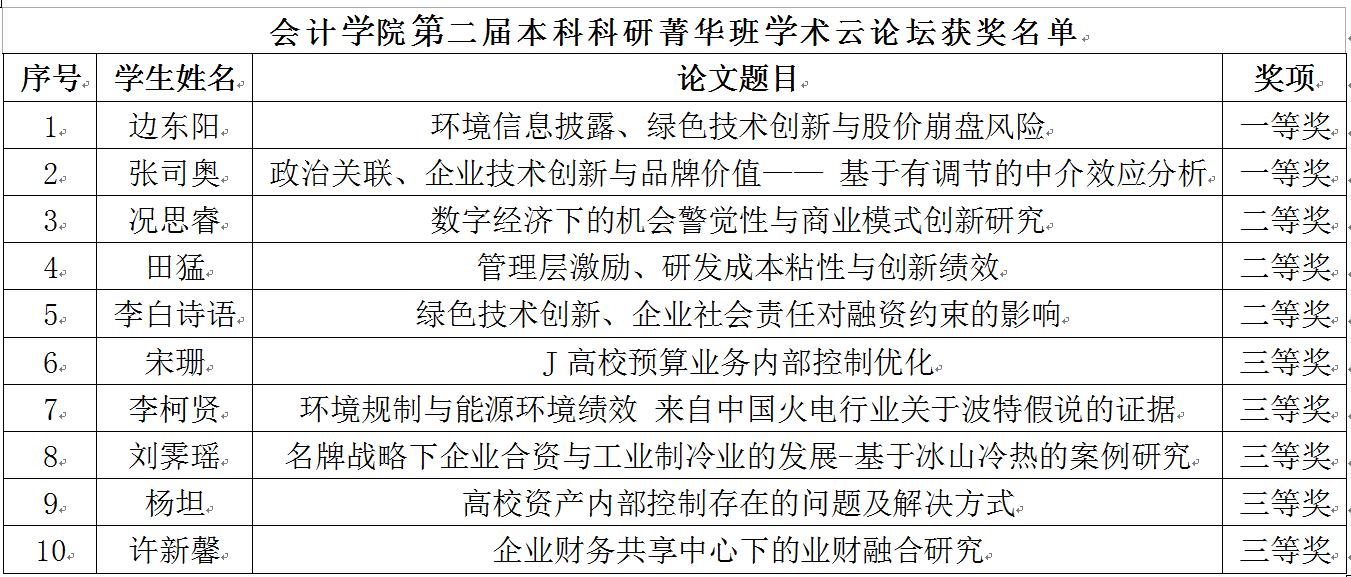 会计学院此次举办的第二届本科生科研菁华班学术云论坛是从2021年12月6日开始征集参会论文,历时4个多月,共收到参会论文17篇。经过学院匿名评审,最终筛选出投稿论文总量的60%(10篇论文)进行交流汇报。学术论坛交流中,会计学院三位青年博士教师作为评委现场打分,最终评选出一等奖2名、二等奖3名、三等奖5名。