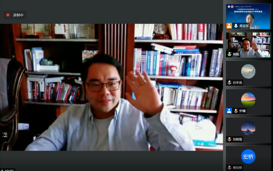 本网讯(亚泰工商管理学院 供稿)近日,由我院主办,科研处、吉林省服务业研究基地、吉林省企业管理创新研究中心联合承办的题为《如何利用平台经济提升产学研效率》的学术报告在腾讯会议线上举行。此次报告由中央财经大学商学院助理教授姚凯主讲,我院科研副院长盛亚军主持,校内外师生70余人线上参加。