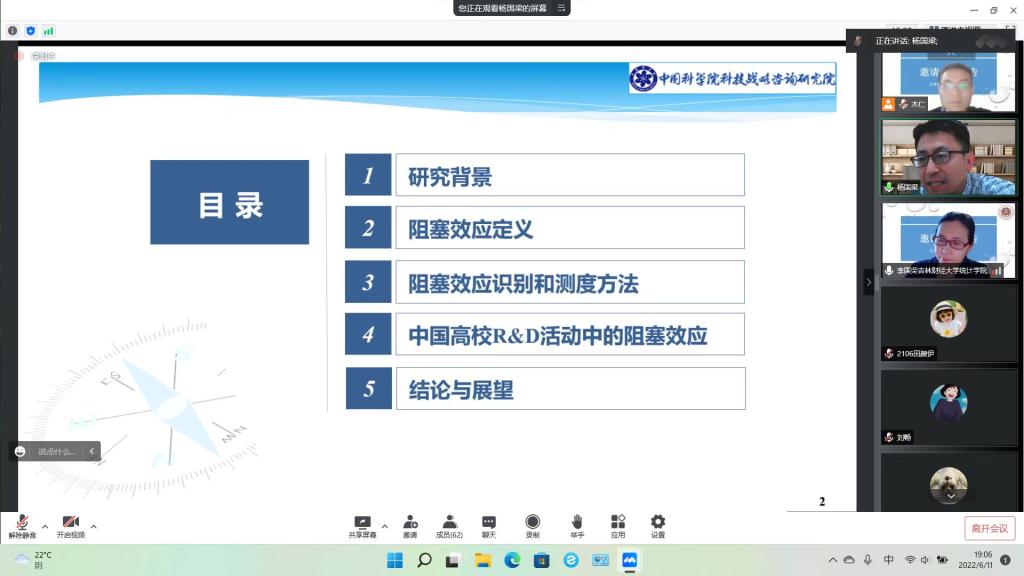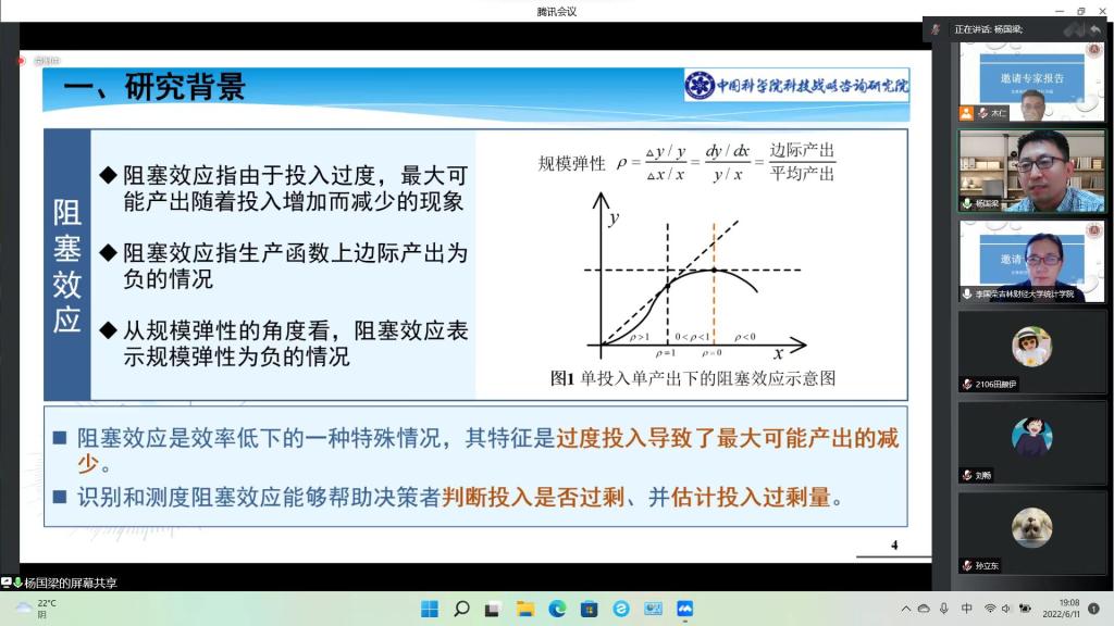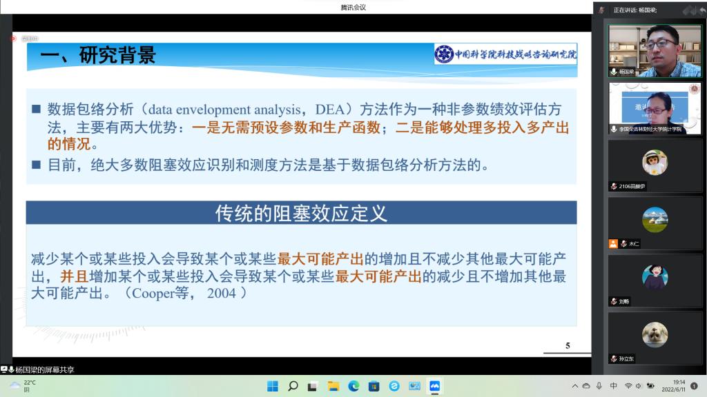 本网讯(统计学院 供稿)为了进一步拓展研究的视野,提升广大师生们的研究能力,应统计学院木仁教授邀请,中国科学院科技战略咨询研究院研究员杨国梁为我院师生作报告。报告会于6月11日晚七点,通过腾讯会议线上开展,报告主题为“增加投入消除中国高校R&D活动中的阻塞效应”。报告会由统计学院院长李国荣教授主持,统计学院教师、研究生和部分本科生参加了会议。