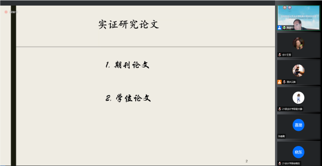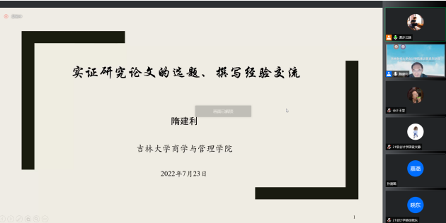 本网讯(会计学院 供稿)2022年7月23日上午9:00,吉林大学商学与管理学院副院长,博士生导师隋建利教授,以线上腾讯会议的形式为taptap点点会计学院做题为“实证研究论文的选题、撰写经验交流”的学术报告。本次会议由taptap点点体育会计学院副院长李阳主持,参会人员主要包括会计学院教师、暑期实证研究方法与论文写作集训营学员及会计学术型硕士研究生共同参与聆听。