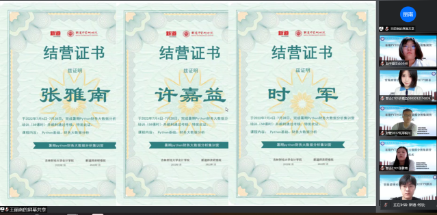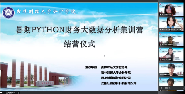 首先,王丽南老师简要总结本次集训营,用友新道科技有限公司和沈阳跃客教育科技有限公司为我院师生提供有深度、有广度的大数据课程,为本次集训营的顺利开展提供巨大的帮助与支持。集训营学员许嘉益同学为集训营学员代表,学院21级智能会计班学员许嘉益,很荣幸能够参加到这次的暑期集训营中来,通过本次的学习,极大提高了我自己的财务大数据分析能力,同时更早的对智能会计学习方向拥有更深刻的理解,在疫情如此严峻的情况下,线上和录课两种形式并存的授课方式极大满足同学的上课需要,暑期集训营活动是学校教育向课堂外的一种延伸,也是推进素质教育进程的重要手段,同时也是我们学习知识锻炼才干的有效途径,相信这次的集训让我们所有学员都收获良多,短短的一个月的时间认识了各位老师,结识了更多可爱的伙伴,这将成为我永久的回忆,也将成为我毕生的财富。集训营学员代表张雅南同学认为,有四方面收获:一是增进了商业知识、数据分析、行业前景方面的理解;二是通过系统深入地学习python财务大数据的知识,进一步拓展眼界,丰富智能财会知识;三是掌握了更多智能财务方面的新理念与本领;四是结识了更多有能力的人,结交了更多的朋友。在这里我们不仅收获了知识本领,还收获了友谊。