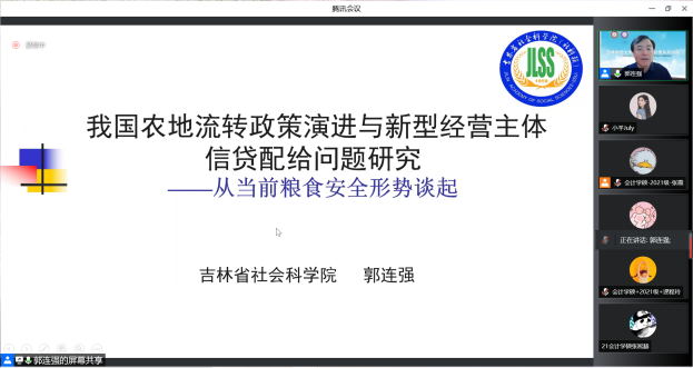 本网讯(会计学院 供稿)2022年8月6日上午9:00,经济学博士、吉林省社会科学院副院长郭连强,以线上腾讯会议的形式为taptap点点会计学院作题为“我国农地流转政策演进与新型经营主体信贷配给问题研究—从当前粮食安全形势谈起”的学术报告。本次报告由会计学院副院长李阳主持,学院教师、暑期实证研究方法与论文写作集训营学员及会计学术型硕士研究生参加了报告会。