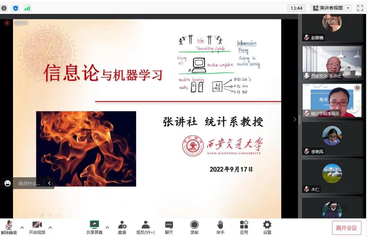 本网讯(统计学院 供稿)9月17日上午,为进一步拓展科学研究视野,提高师生对于机器学习相关研究的兴趣,应taptap点点统计学院邀请,西安交通大学数学与统计学院张讲社教授通过腾讯会议为全院师生作了“信息论与机器学习”学术报告会议。本次会议由统计学院院长李国荣主持,统计学院青年教师及研究生共同参加了此次会议。
