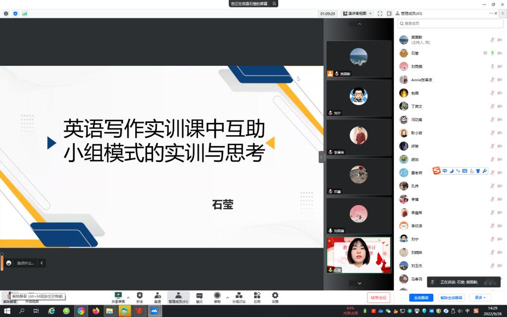 接着,公共外语教研部刘宁、刘雨薇、石莹、李晨希分别从各自的教学实践,依托大学英语系列课程从U校园智慧教学平台的使用、BOPPPS教学模式的应用、互动式教学方法以及多元过程性评价等方面做了分享。
