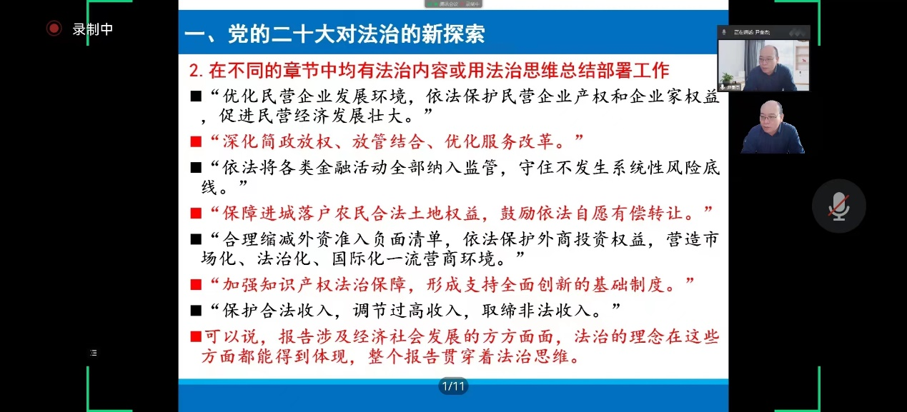 尹奎杰教授首先从党的二十大对法治的新探索讲起,概括了党的二十大报告中的整体情况,包括对过去社会主义法治思想的实践梳理、对如今社会主义法治思想发展的定位和对未来法治建设新征程的美好祝愿。同时尹奎杰教授还讲解了党的二十大报告中关于全面依法治国理念的内容、法治建设目标,对法治建设成果给予了充分肯定。