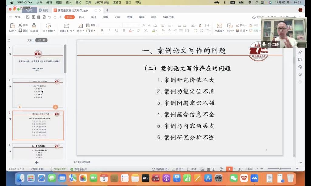 刘仁琦副教授以对法学院研究生案例论文的观察为前提,在12月5日的讲座中,有针对性地对研究生案例论文写作中存在的问题进行了精准地归纳,并对案例论文写作中作为引出问题的案例与作为论证论据的案例应当如何选取进行了详细的分析。在明确了案例选择的范围和方法后,刘仁琦副教授向同学们讲授了案例论文写作的常规研究方法,并逐一分析其对研究生而言的使用注意事项。刘仁琦副教授最后强调在案例论文撰写时,应当对案例的现象与问题、做法和原因进行分析,注重理论总结与归类,并对规则和理论进行阐述,如此才能写好一篇案例论文。