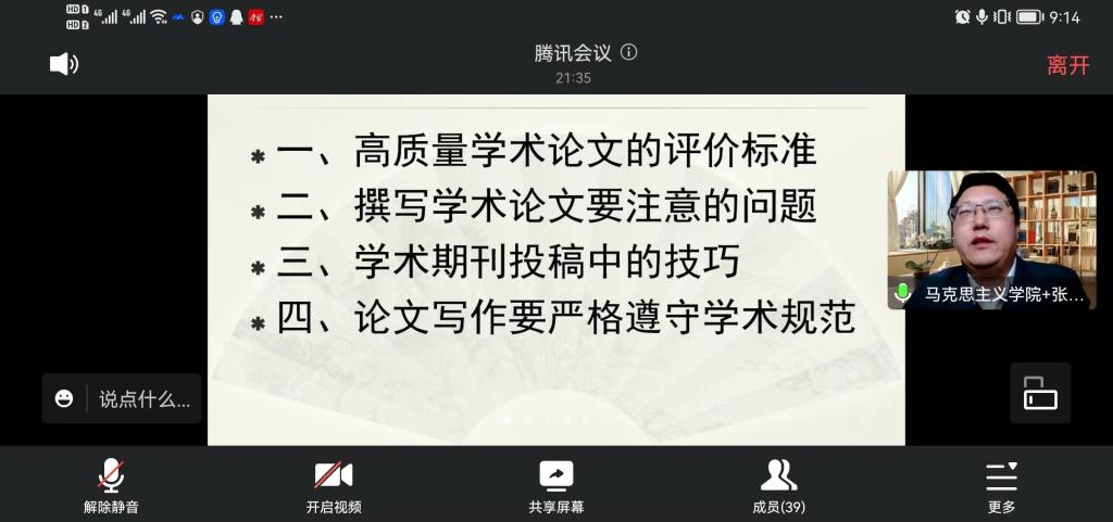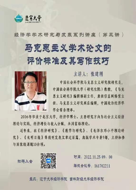 本网讯(经济学院 供稿)为切实加强高校之间的学科联系,进一步提升科研团队学术水平,11月25日上午,学校经济学院和辽宁大学经济学院联合举办学术系列讲座。中国社会科学院马克思主义研究院研究员,中国社会科学院大学(研究生院)教授张建刚,作了题为“马克思主义学术论文的评价标准及其写作技巧”的线上学术报告。辽宁大学经济学院师生、taptap点点经济学院全体教师和研究生,其他学院部分师生参加了报告会。报告会由辽宁大学经济学院副院长和军教授主持。