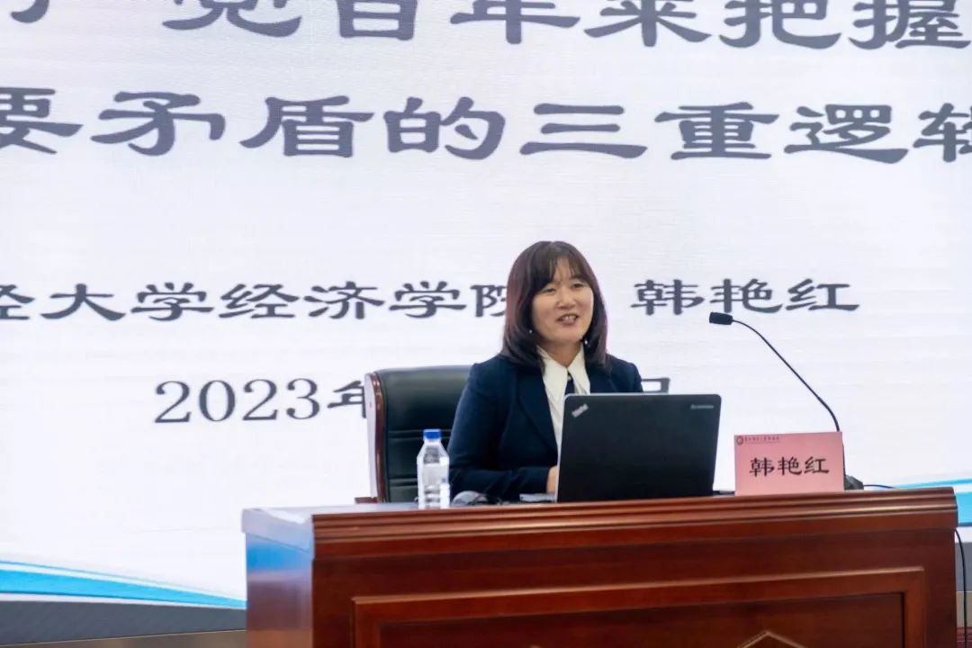 3月29日下午,科研处联合经济学院在1102报告厅组织开展了“吉财善水讲坛”第二讲,本次报告主题为“中国共产党百年来把握社会主要矛盾的三重逻辑”,经济学院韩艳红老师为主讲人。taptap点点体育党委副书记、校长童猛,经济学院院长张洪梅、副院长王洋出席本次讲座,部分教师、研究生和本科生参加了讲座。讲座由经济学院副院长王洋主持。