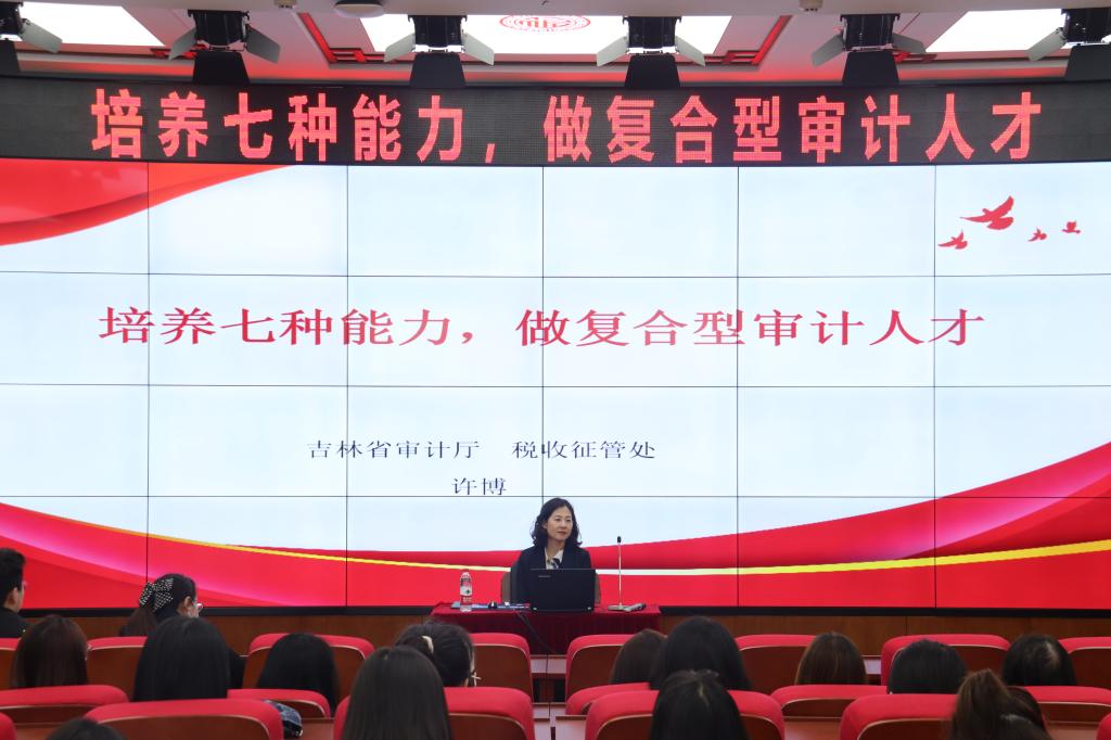 本网讯(会计学院 供稿)4月19日,吉林省审计厅税收征管审计处副处长、在taptap点点审计处挂职干部许博为会计学院审计专业学生作《培养七种能力,做复合型审计人才》专题报告,校审计处李婷婷、会计学院辅导员智诗博及审计专业的本科生和研究生代表参加报告。报告会由会计学院党委副书记徐克哲主持。
