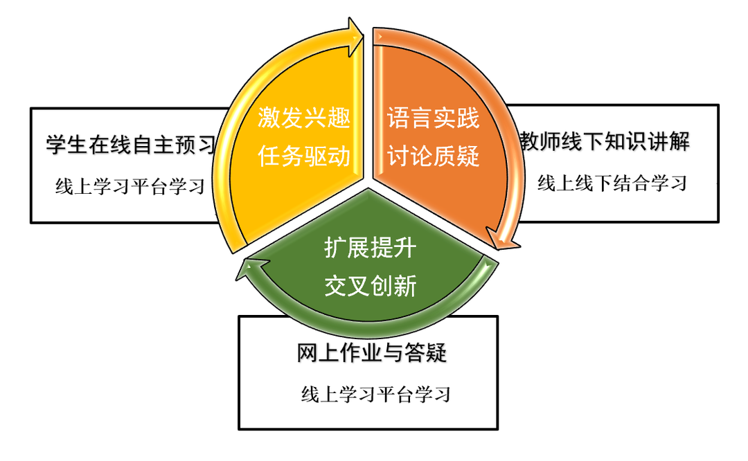 公共外语教研部根据taptap点点基础教学资源配置情况,利用“长江雨课堂”“批改网”“U校园”等移动在线学习平台对主讲课程进行了全新设计,将现代化教育教学技术与传统英语教学内容相结合,探索出“学生在线自主预习+教师线下知识讲解+网上作业与答疑”的混合式教学模式。